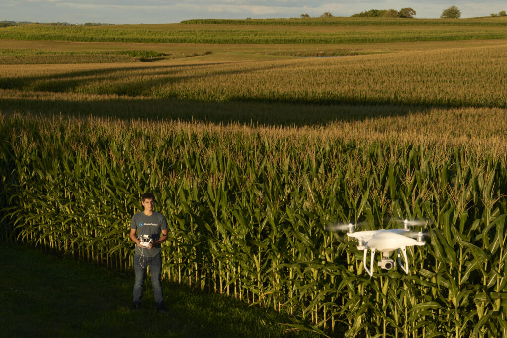 Kyle Miller, who works in Agricultural Business Development at DroneDeploy, operates a DJI Phantom 4 Pro drone over his parents’ farm near Iowa City, Iowa. DroneDeploy creates software that allows a computer or mobile device to highlight an area for a drone to survey. DroneDeploy then selects the most efficient route for the drone to fly and executes the flight pattern, taking several images per second and immediately stitching together images of the field for the user.